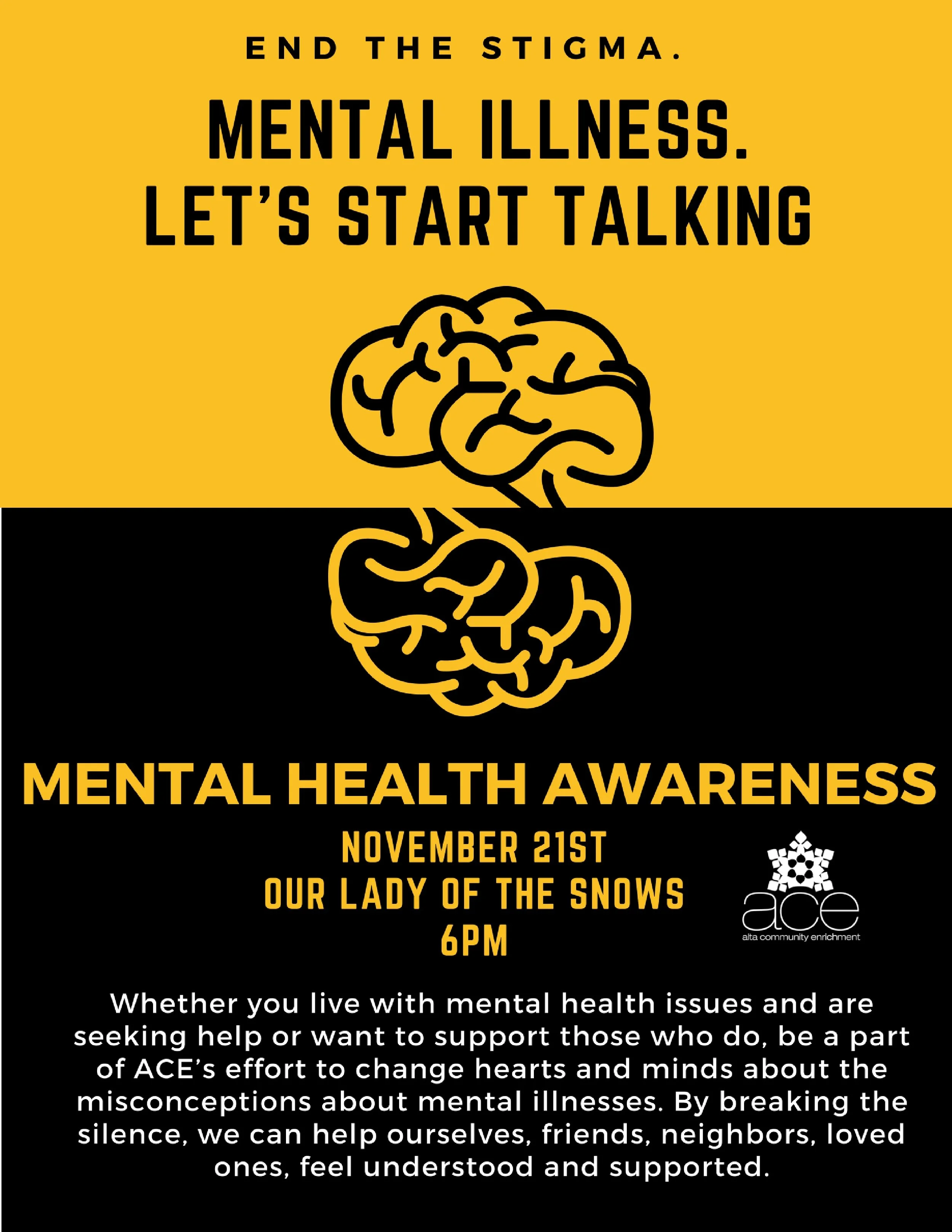 Whether you live with mental health issues or want to support those who do, be a part of ACE’s effort to change hearts and minds about the misconceptions about mental illnesses. By breaking the silence, we can help our friends, neighbors, loved ones, and colleagues feel understood and supported.