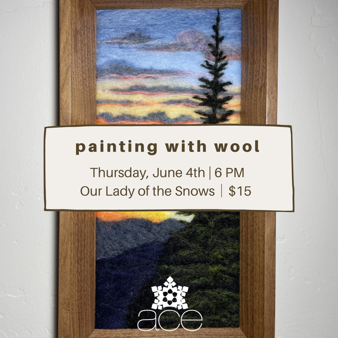 In this class, students will learn how to needle felt using a single felting needle and a variety of colorful wool fibers to create a 2D wool painting. Wool painting is done by pushing wool fibers into a flat piece of wool felt with a foam pad underneath. Students will learn how to blend wool colors and a number of techniques for forming desired shapes and textures with the wool. If you enjoy creating with repetitive motion and a medium that is easy to adjust and learn with, this class is for you! Students will leave with a 6x6 inch landscape wool painting of Mount Wolverine.