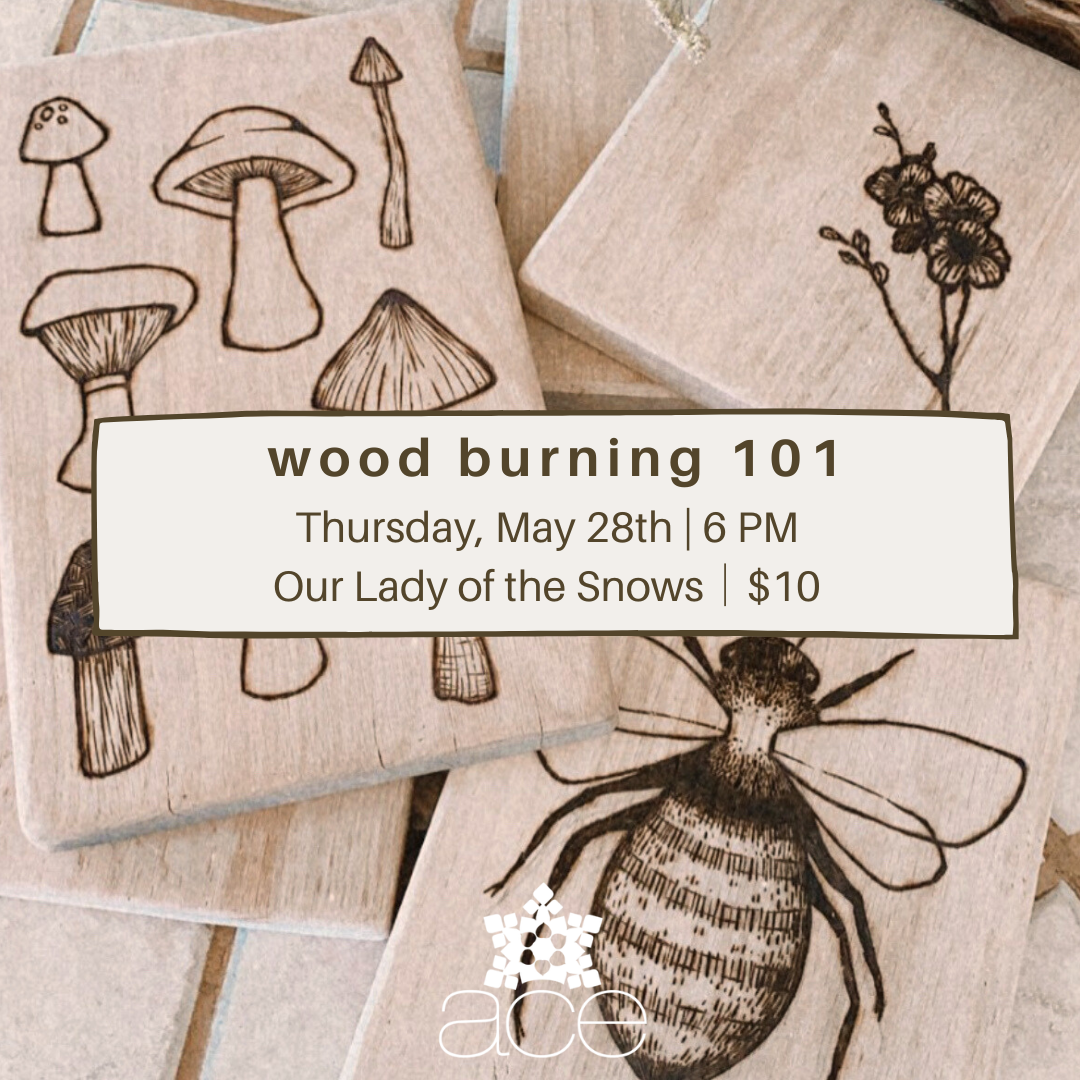 Learn the basics of wood burning! You will learn step by step the art of wood burning, and important tricks and tools of the trade. Students will have the opportunity to create a design on a tree ornament.